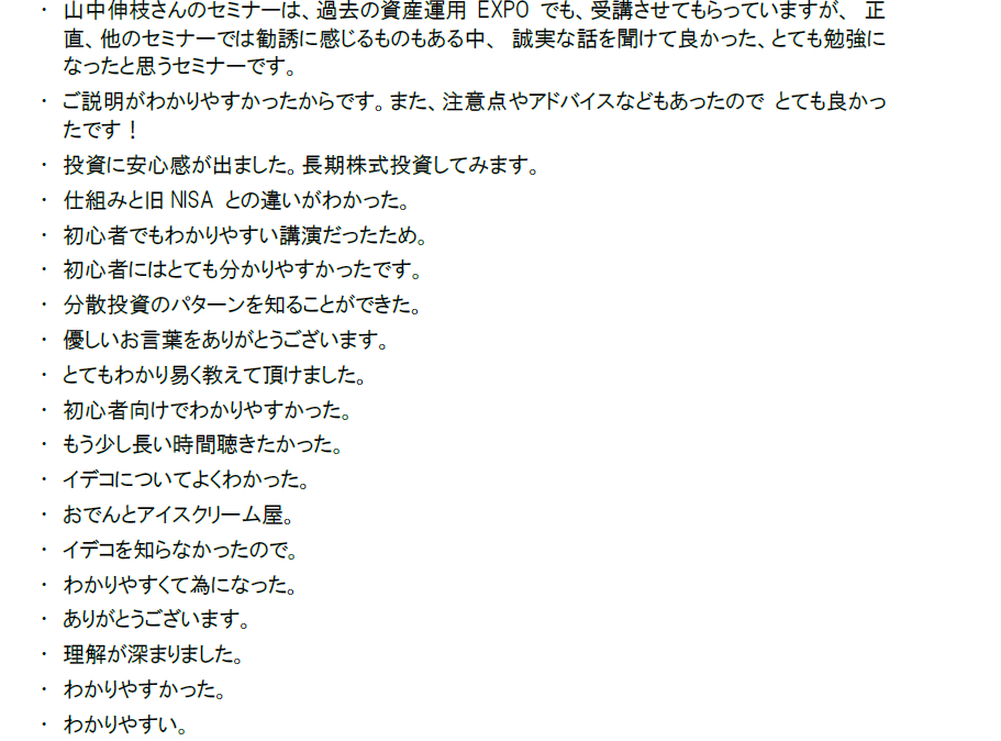 セミナー満足度は、90.07%という高い評価をいただきました。またご丁寧にもコメントを書いてくださる方もいらっしゃいました。