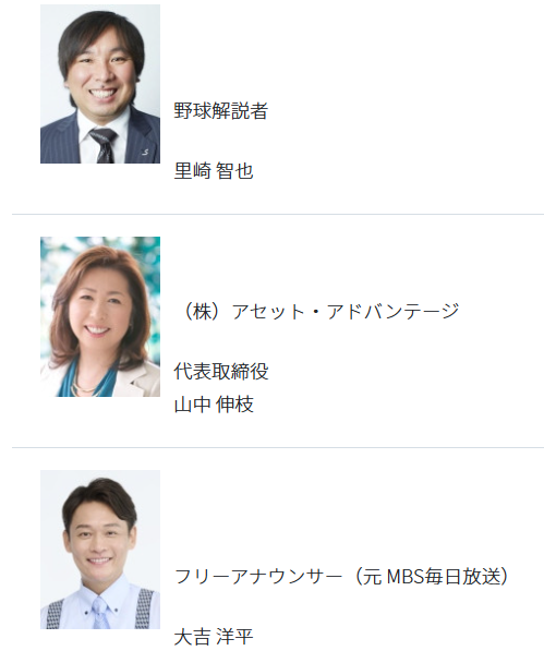 HOME > お知らせ > セミナー告知 > 2026年5月15日 ビッグサイトにて野球解説者里崎様と対談します。 セミナー告知 2026年5月15日 ビッグサイトにて野球解説者里崎様と対談します。 2026 03.27 [金] 里崎さんと考える資産運用 講演者 山中 伸枝 株式会社アセット・アドバンテージ代表取締役 確定拠出年金相談ねっと代表 一般社団法人公的保険アドバイザー協会 理事 プロフィールページ \ この記事をシェアする / LINE 一覧に戻る